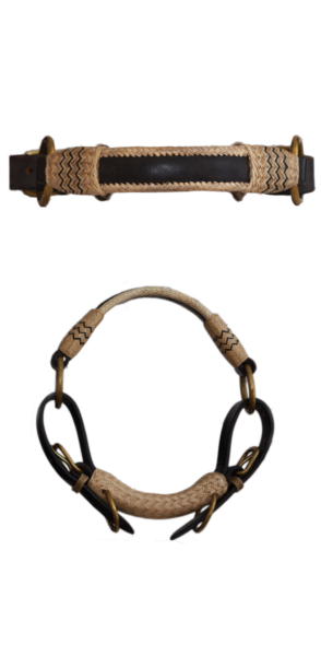 Die dazugehörige Barbada (Kinnstück) ist ebenfalls mit feingearbeiter Rohhaut umflochten. Die messingfarbenen Schnallen und Ring runden das Gesamtbild ab.