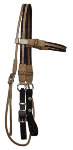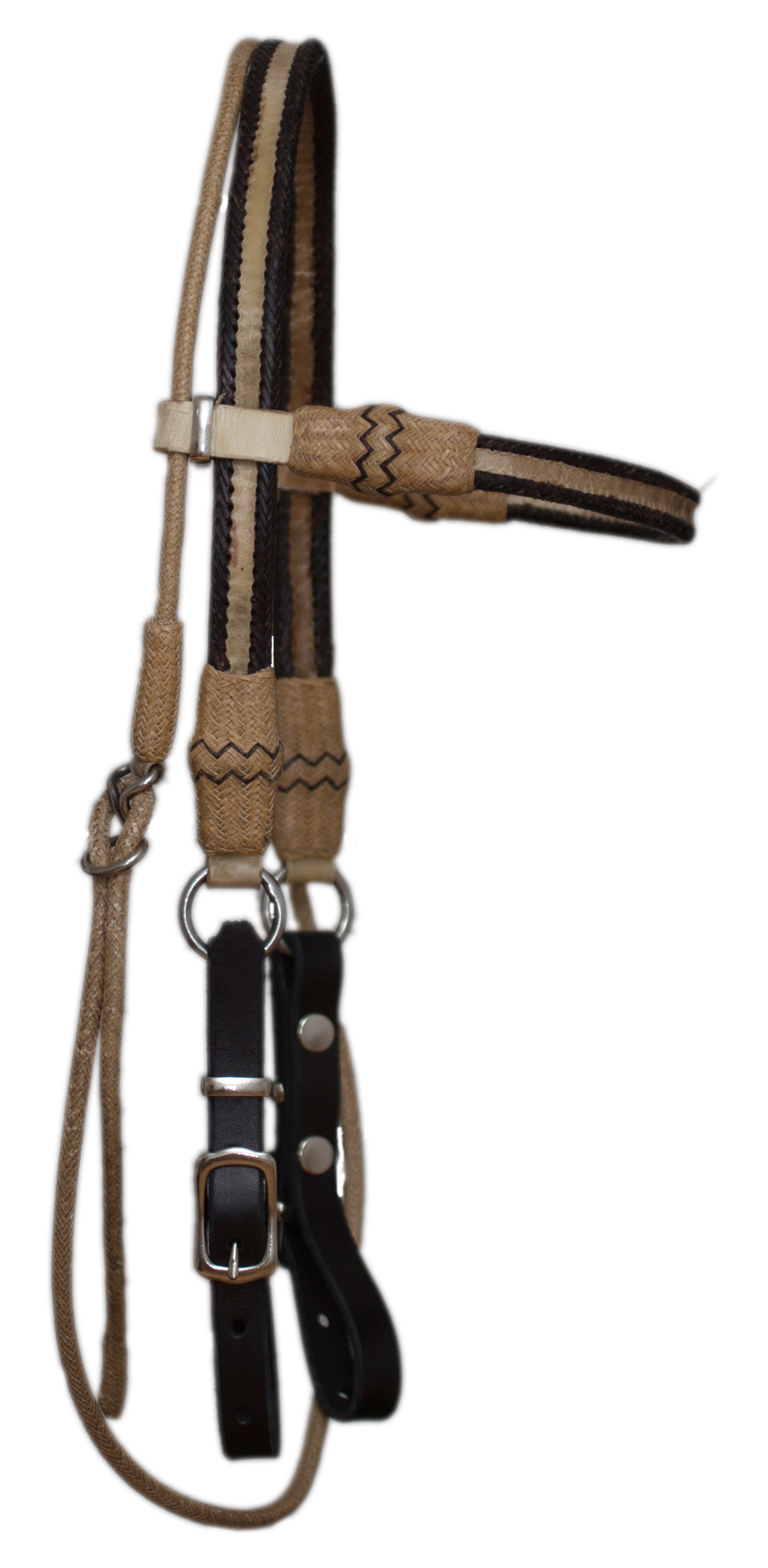 Kopfstück zweifarbig – komplett aus Rohhaut in Handarbeit; Backenstücke aus schwarzem, hochwertigem Leder: silberfarbige Schnallen