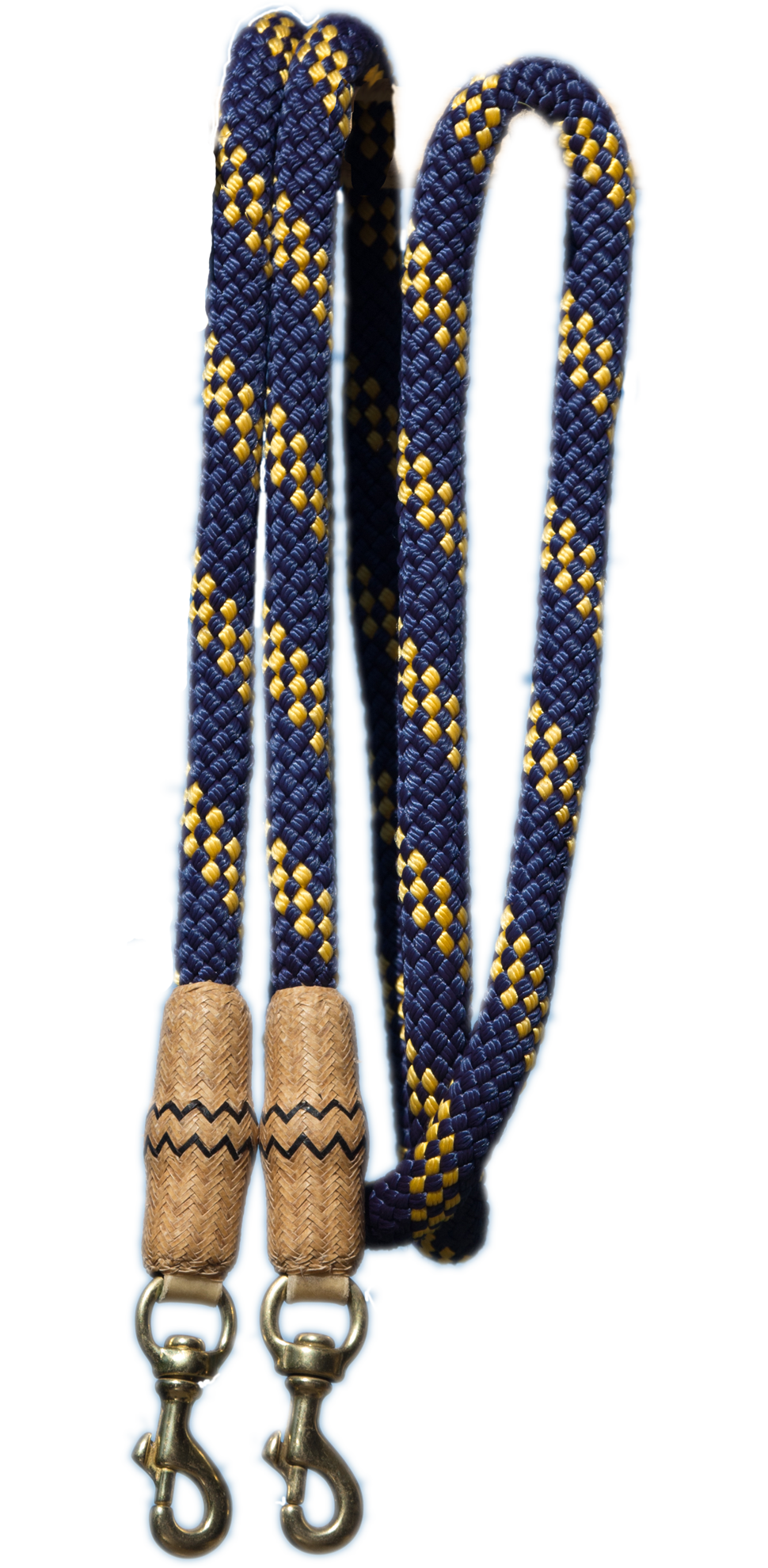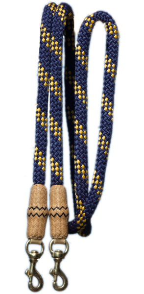 Blau/gelbe Nylonzügel aus hochwertigem, schwerem Material mit geflochtenen Rohhauteinfassungen und Snaps
